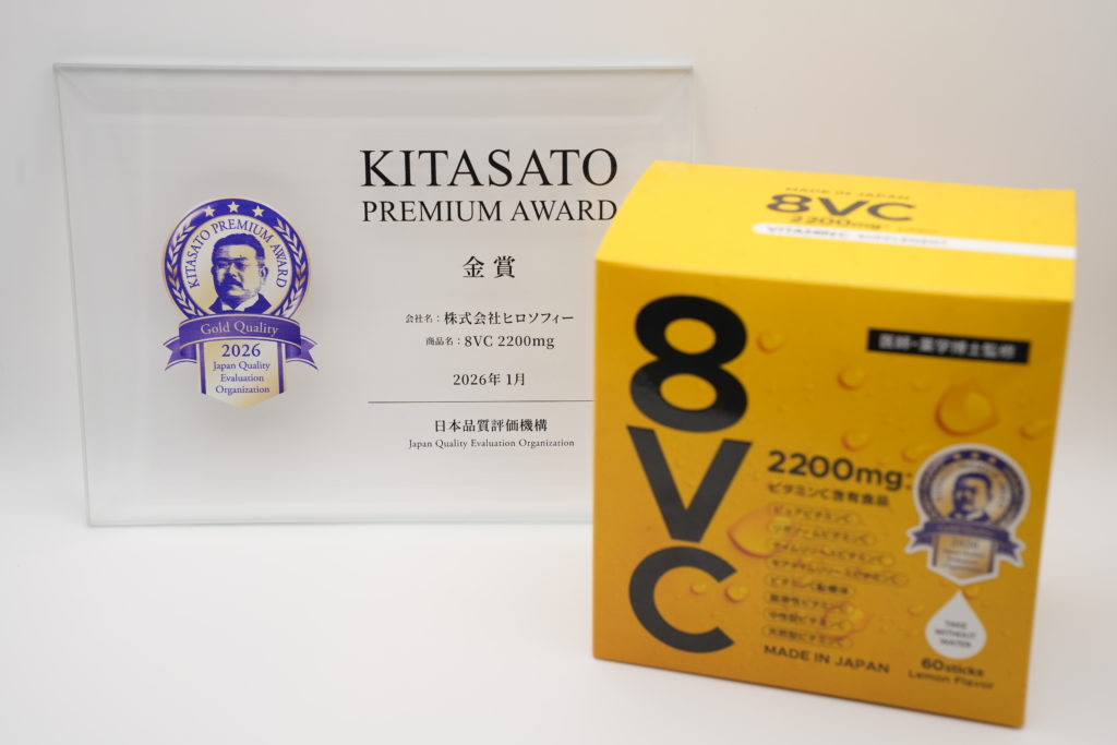 私たちヒロソフィー(株式会社ヒロソフィー、本社:東京都港区)は、この度、自社サプリメント「8VC 2200mg」および「グルコサミン2200+MSM」の2商品において、日本品質評価機構が運営する「KITASATO Premium Award™(以下、KPA)」の金賞を受賞いたしました。
